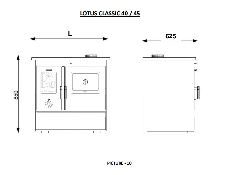 Abmessungen des kaminofen: Breite 970 mm, Tiefe 625 mm und Höhe 850 mm