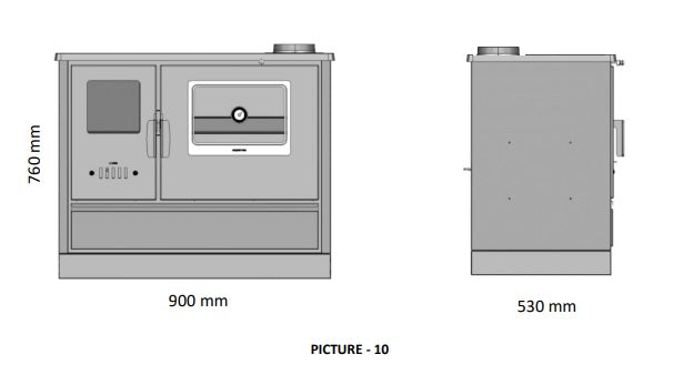 Abmessungen des kaminofen: Breite 900 mm, Tiefe 530 mm und Höhe 760 mm